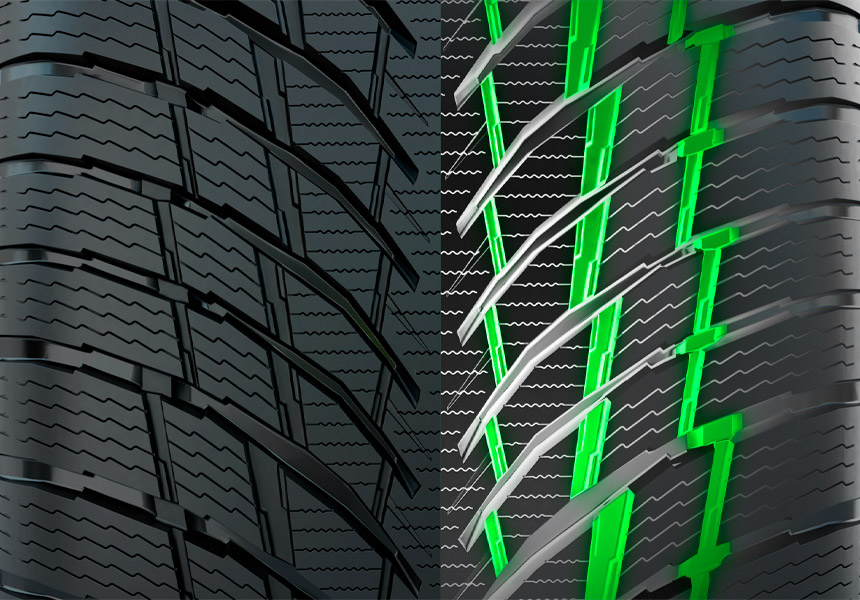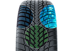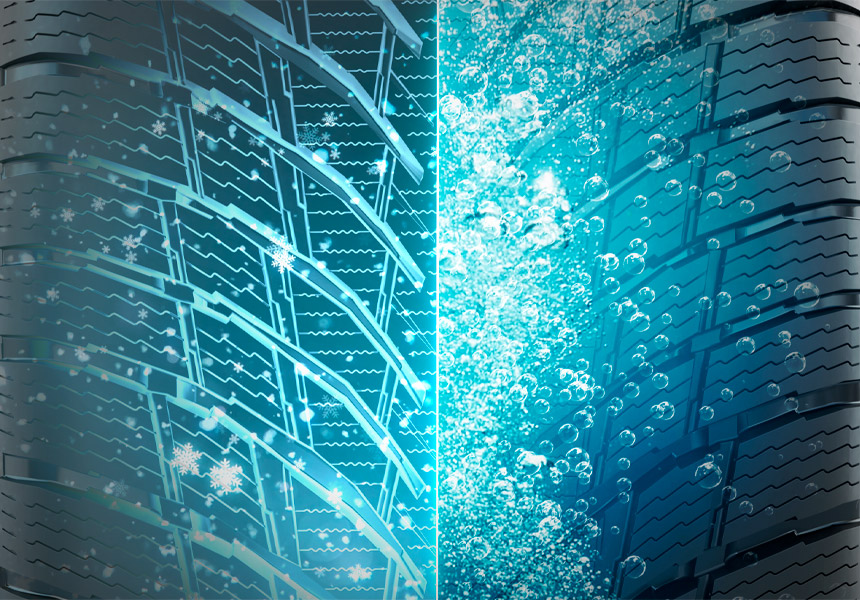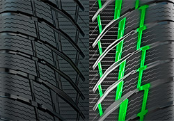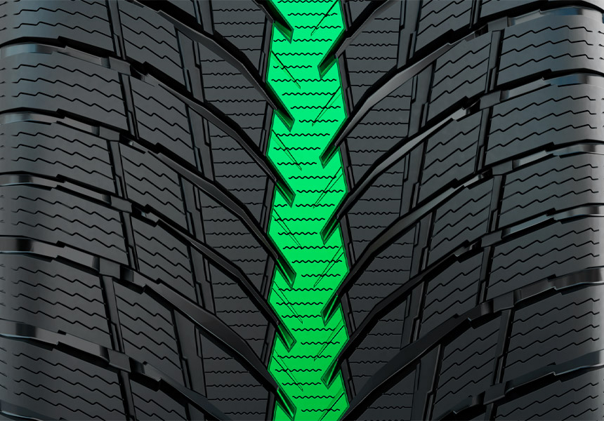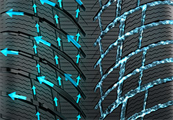 Густая сеть ламелей в сочетании с направленными латеральными канавками обеспечивают быстрое и эффективное отведение воды из пятна контакта, что отражается на безопасности и поведении автомобиля в сырую погоду.