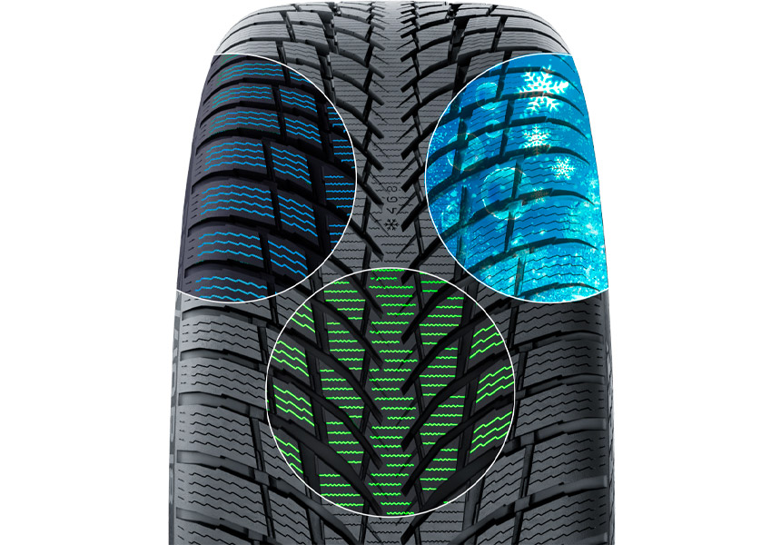Для того чтобы повысить сцепления и облегчить маневренность был оптимизирован рисунок протектора: центральное ребро жесткости для курсовой устойчивости; адаптированные ламели для обеспечения тягово-сцепных характеристики при разгоне и торможении; плечевые блоки для устойчивости на поворотах.